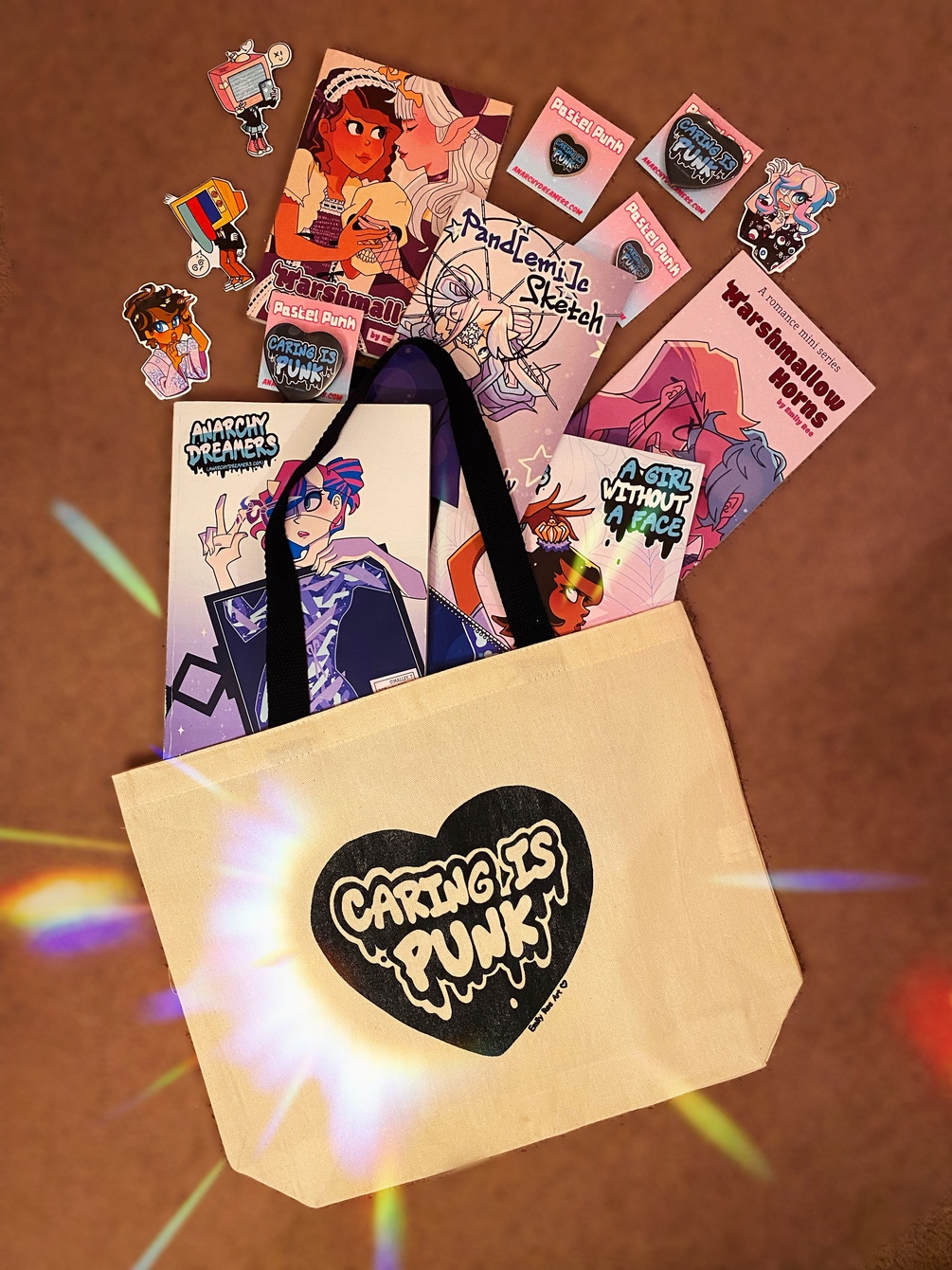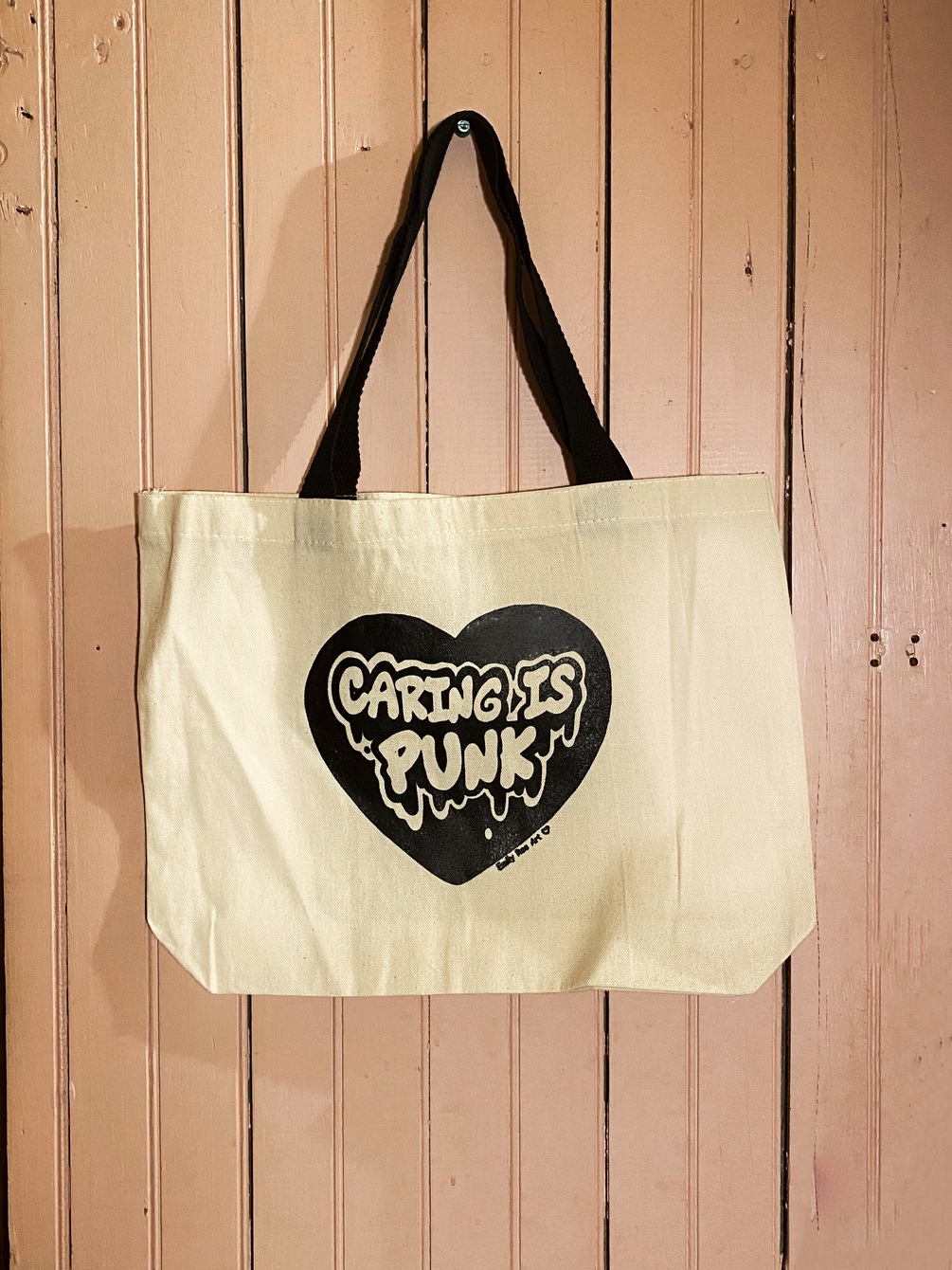Be caring! Be a punk! Use a reusable cotton canvas bag wherever you go! Unless you forget LOL. But it’s good to have tote bags around. This tote bag has reinforced handles and is great to use as a purse, carry groceries, and more!